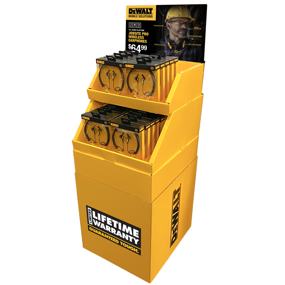Feature the newest version of a top seller in your store! Entice your customer with the Jobsite Pro Wireless Earphones in this convenient display. The comfort of these neckband earphones will make a huge difference to your customers - and your sales!